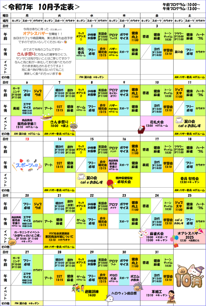オアシスでは多くのプログラムの中から、自分の目標に合わせて自由に参加することができます。デイケア利用に興味のある方は、いつでもご連絡ください。