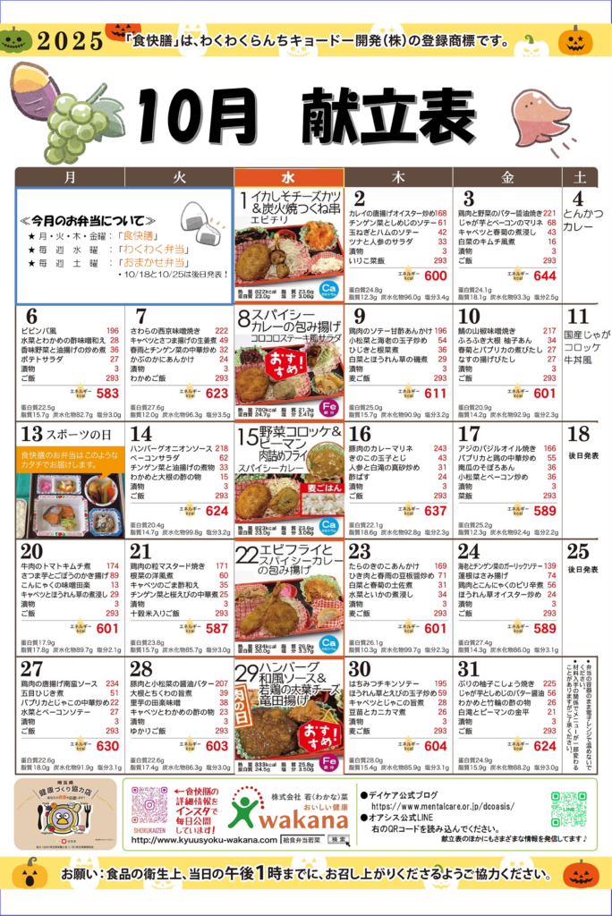 ※10/18(土)、10/25(土)の献立に関しては後日発表となります。