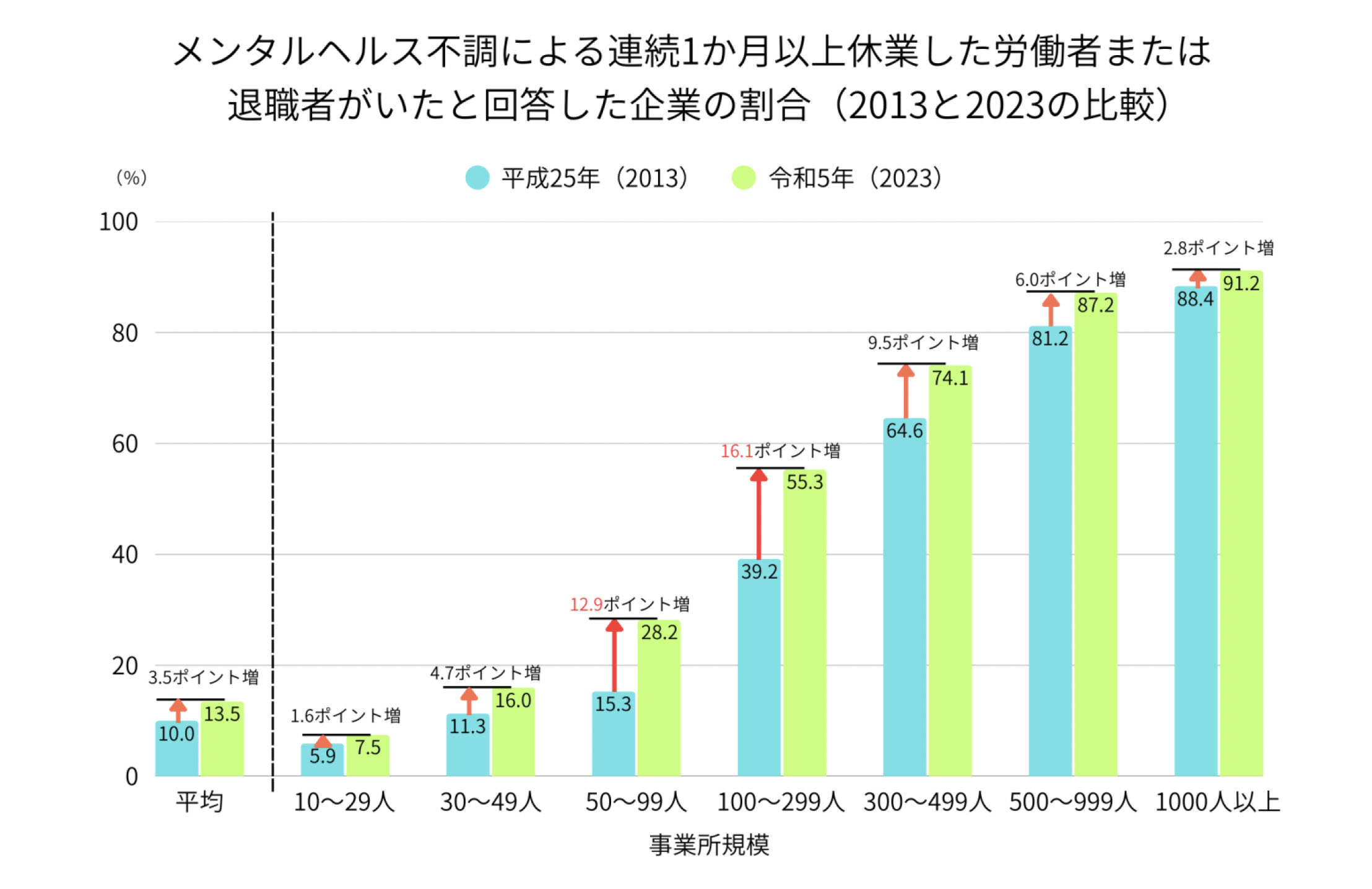 メンタル不調の休職者または退職者がいたと回答する割合は事業所規模が大きくなるほど増え、「50~99人」で28.2%、「300~499人」で74.1%、「1000人以上」では91.2%です。また、事業所規模ごとに比較してみると「50~99人」で12.9ポイント、「100~299人」で16.1ポイントの増加がみられ、特に中小企業での休業者・退職者が増えているという結果になっています。
