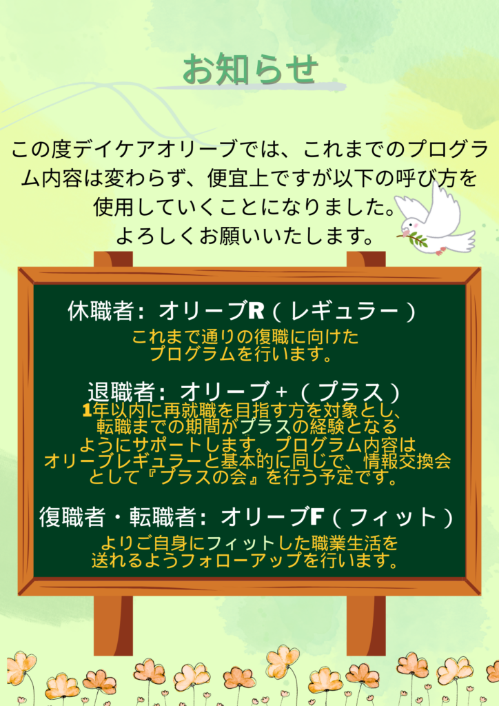 この度デイケアオリーブでは、より多くの方の社会復帰・再就労を支援するために「退職された方」も利用できるようになりました。